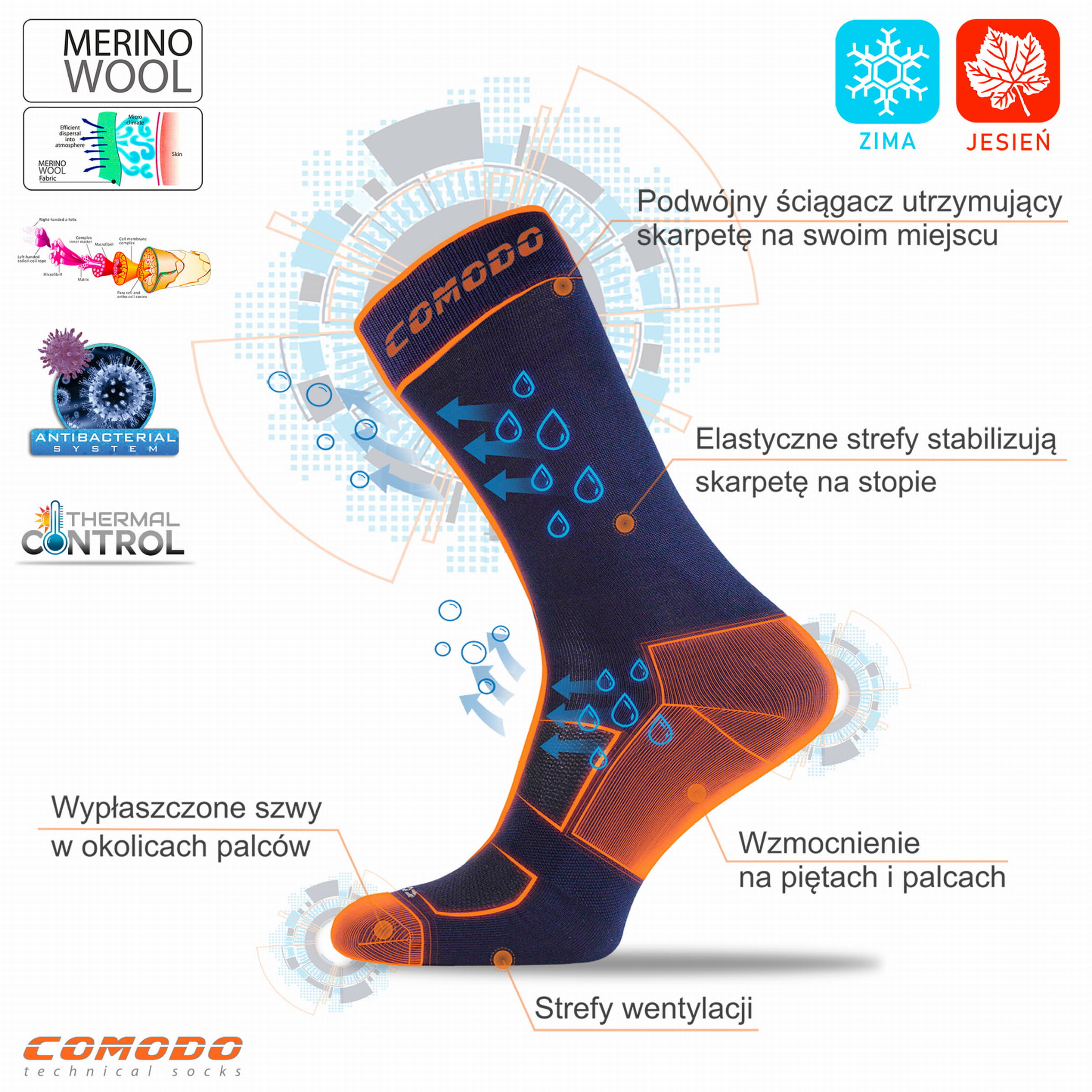 Wełna merynosowa i akryl zapewnia doskonałą izolacje termiczną, chroni stopy przed chłodem, ale również przed przegrzaniem.
